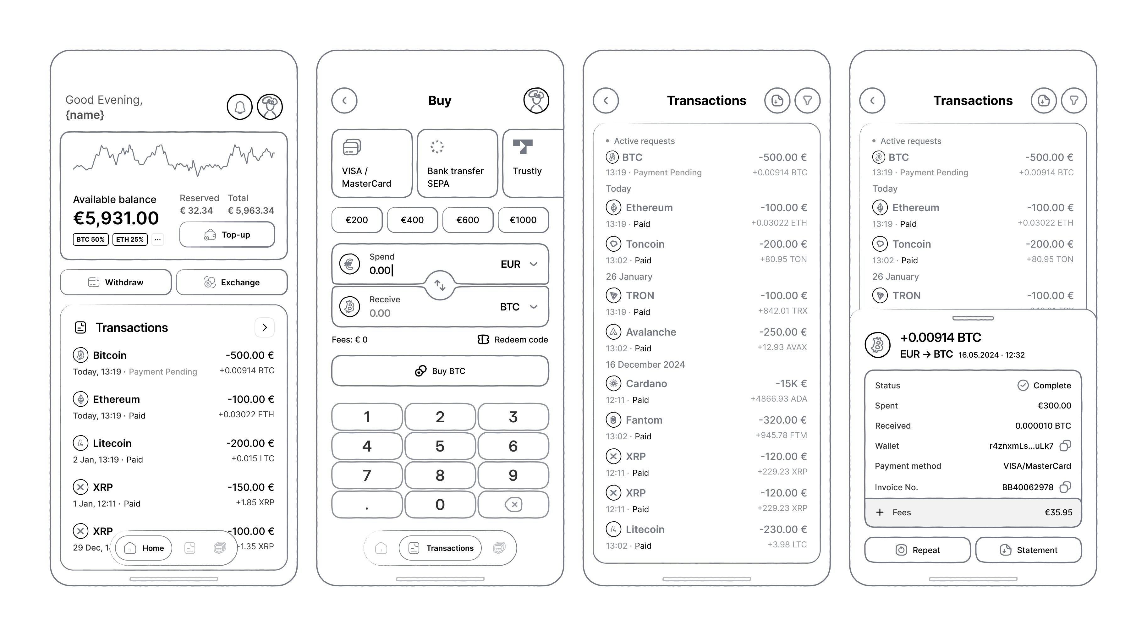 These wireframes form the first functional concept of the BTCBIT mobile app, defining layout logic, hierarchy, and exchange flow before applying visual direction.