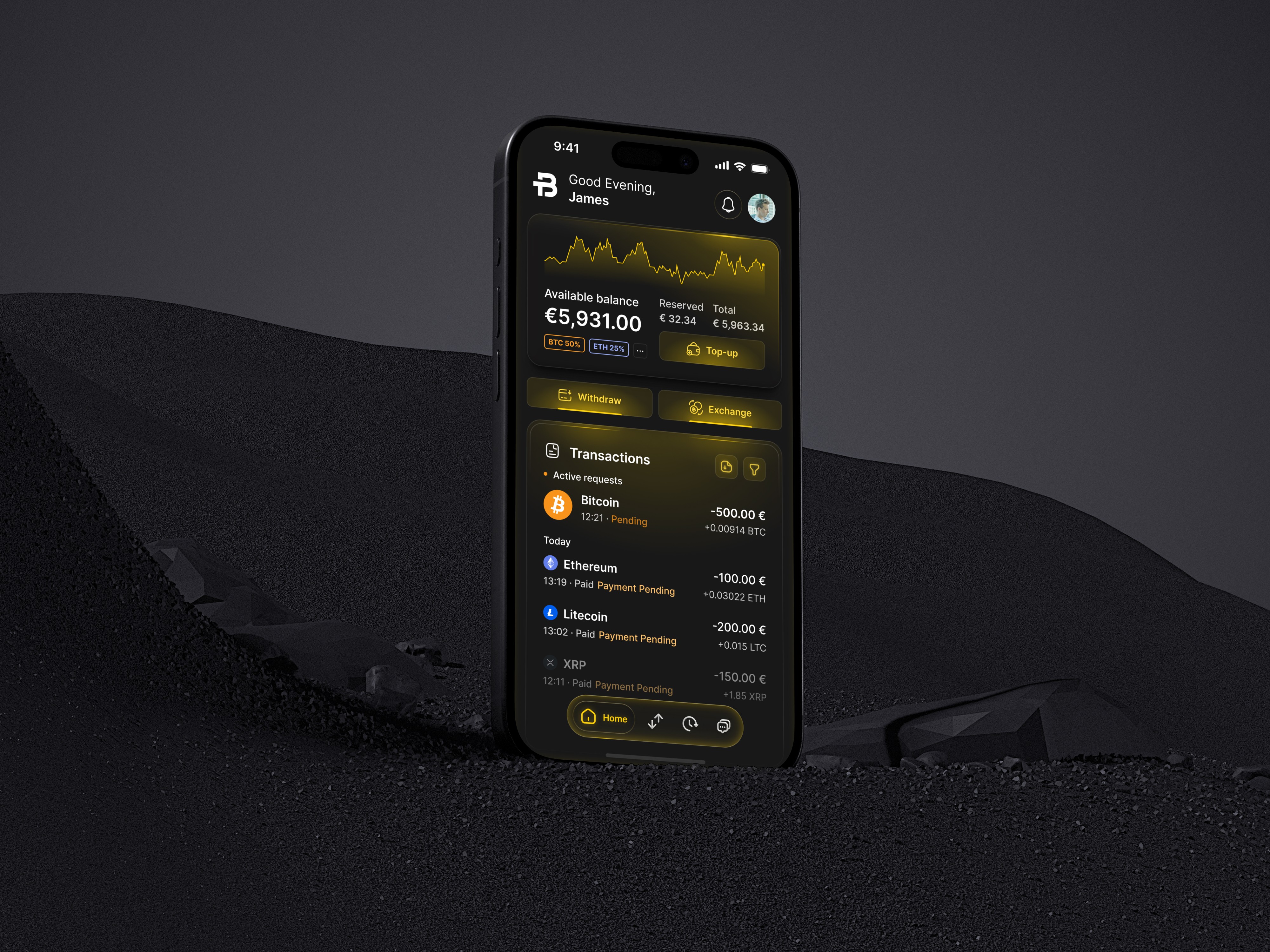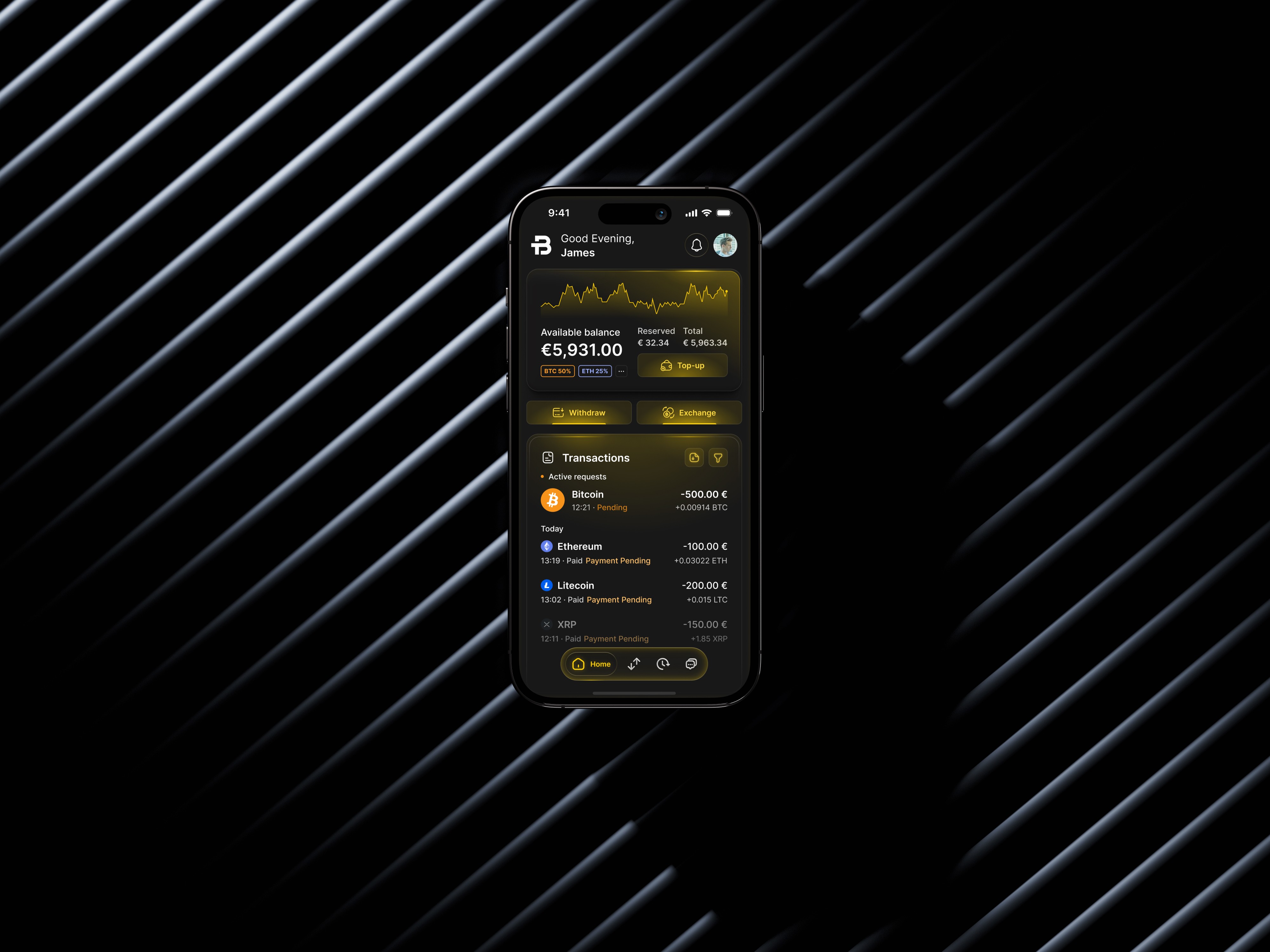 Dashboard: Central hub showing total balance, quick actions (Top-up, Withdraw, Exchange), and recent transactions for instant clarity.