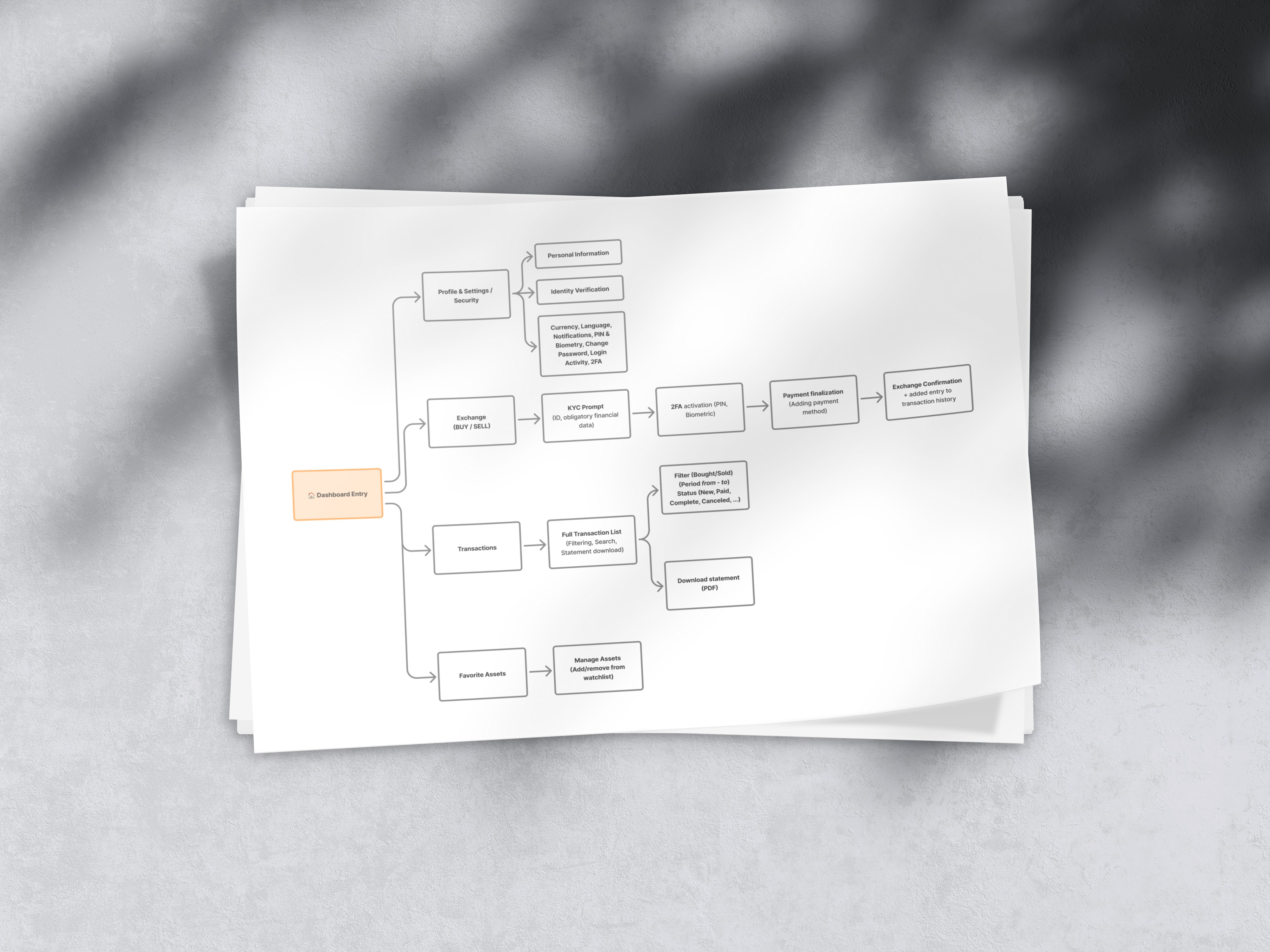 IA (Information Architecture) structure ensures all key exchange functions, profile management, transactions, and asset tracking are accessible through a centralized entry point in the product.